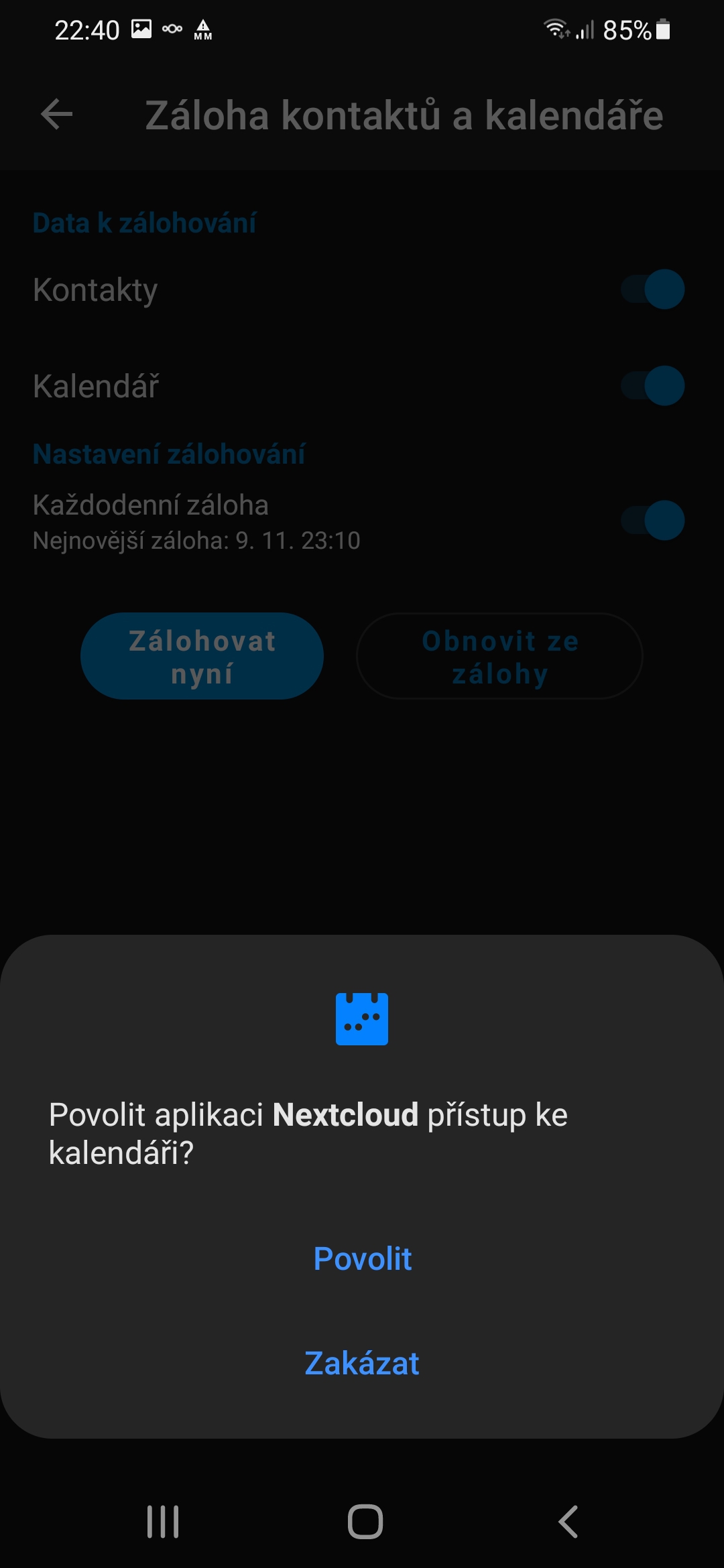Po zapnutí zálohování kalendáře je vyžadováno povolení přístupu