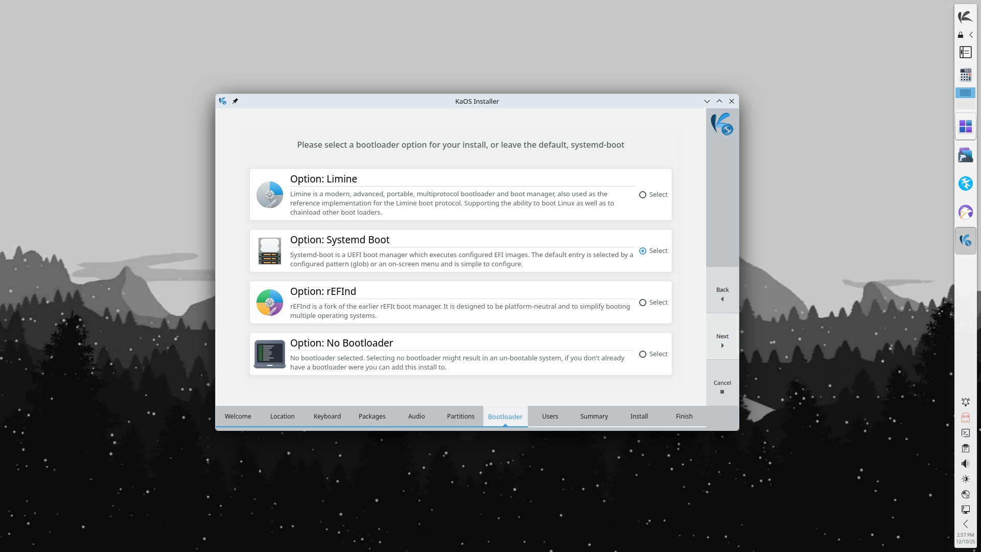 Vývojári KaOSu začali distribuovať systémový zavádzač Limine, zatiaľ však iba výhradne na testovanie. Záujemci si môžu zvoliť Limine v inštalátore systému Calamares. Dôležitejšími novinkami verzie KaOS 2025.11 sú pravidelné aktualizácie softvérových balíčkov. Dostupné je napríklad novšie jadro Linux 6.17.9, knižnica Mesa 25.2.7 alebo balíčky pre systemd 257.10, OpenZFS 2.3.5, OpenSSH 10.2 či Bash 5.3. Dodatočne pribudla opravná aktualizácia desktopového prostredia KDE Plasma 6.5.3 spolu s kolekciou aplikácií KDE Gear 25.08.3 a balíkom softvérových komponentov KDE Frameworks 6.20. Nakoniec môžu používatelia nájsť v repozitároch nové softvérové balíčky pre Niri, Quickshell a Noctalia Shell.