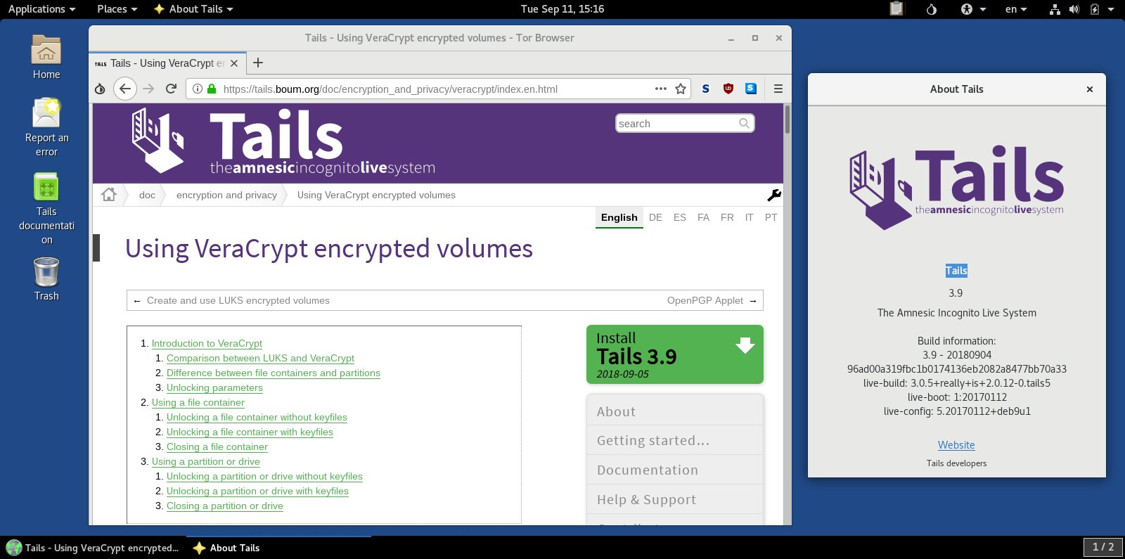 5. septembra (září) vyšla nová verzia Tails s označením 3.9. Novinkou v tejto verzii je napríklad možnosť automatickej inštalácie softvéru pri štarte operačného systému, či pridanie podpory pre VeraCrypt. Upgrade dostal aj prehliadač Tor a to konkrétne na verziu 8.0. Tu je treba ako poznámku dodať, že len veľmi nedávno spoločnosť Zerodium, ktorá sa zaoberá nákupom bezpečnostných zraniteľností, uverejnila informáciu, že prehliadač Tor obsahuje zraniteľnosť, ktorá umožňuje obísť najbezpečnejší level NoScript-u, ktorý blokuje JavaScript na webových stránkach. Dobrou správou nie len pre Tor, ale aj pre Tails je, že verzii Tor 8.x sa táto zraniteľnosť už netýka.