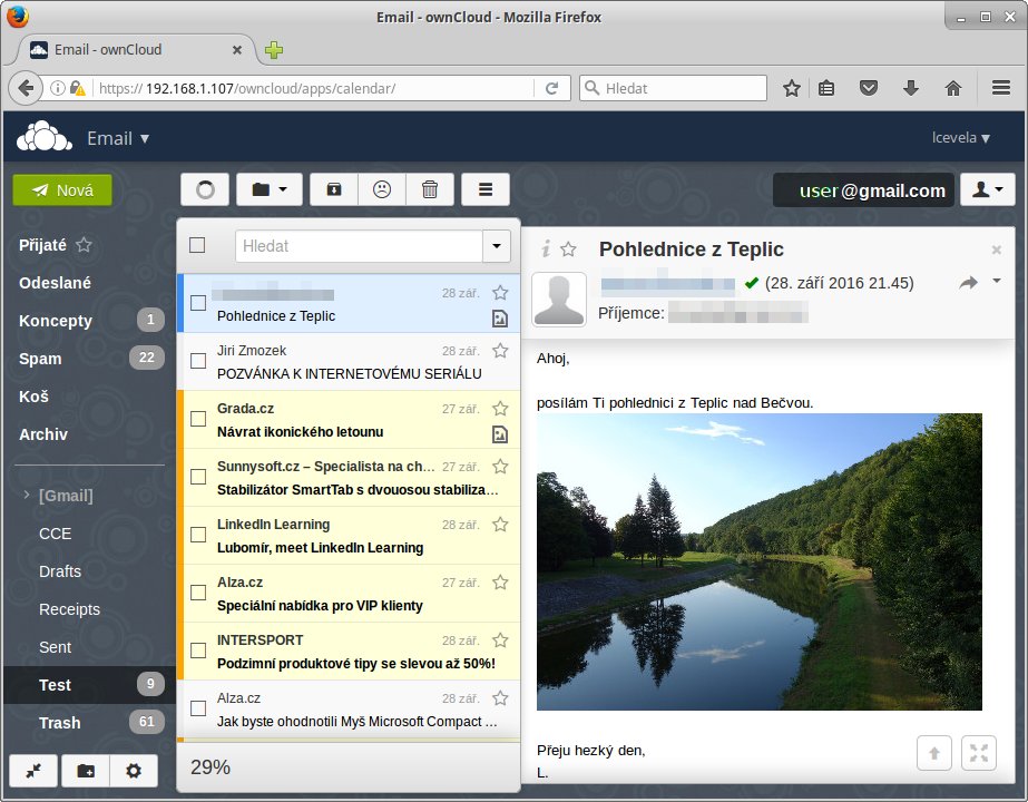 Klient elektronické pošty Mail má totiž přístup ke kontatkům navedeným v aplikaci Contacts a také může přímo vkládat do příloh soubory uložené v datových složkách ownCloudu. Dále lze ocenit zdařilé notifikace (oznámení) při přijetí nové zprávy. Mail má celkově velmi moderní uživatelské rozhraní, ale to je bohužel také zdrojem největší nevýhody tohoto jinak zdařilého programu.