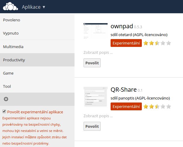 Poslední a bohužel asi nejpočetnější skupina se jmenuje „Experimentální“ a jde o aplikace, které neprošly bezpečnostním prověřením a které lze tedy instalovat pouze na vlastní nebezpečí. Je nutno dodat, že bezprostředně po instalaci ownCloudu, je seznam experimentálních aplikací skrytý. Jeho zobrazení můžete povolit v nastavení instalace aplikací.