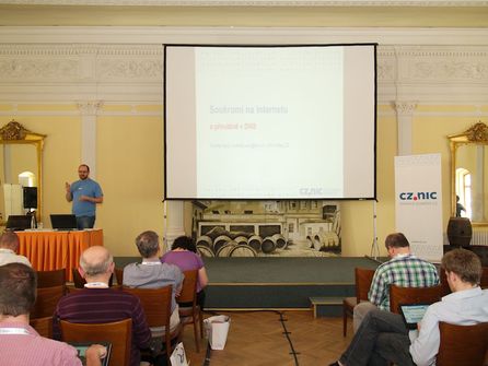 Účastníci konference sledují přednášku Ondřeje Filipa o organizaci ICANN