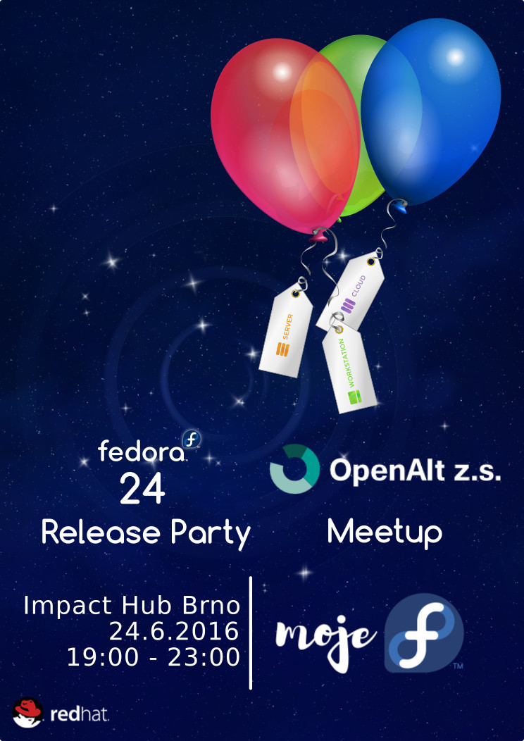 Na závěr článku bych vás chtěl pozvat na Fedora 24 Release Party. Nejbližší je ta brněnská, kterou organizuji já a bude se konat už tento pátek (24. června) v brněnském Impact Hubu. Další Fedora 24 Release Party bude někdy během července v Praze. Na party je samozřejmě vstup zdarma a k dispozici bude občerstvení a také propagační materiály Fedory. Více informací naleznete na webu mojefedora.cz.