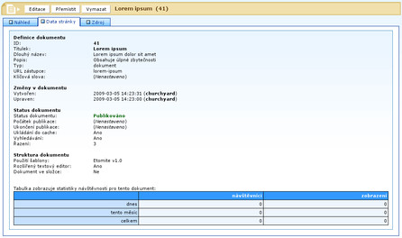 Třetí kartou je Nastavení dokumentu. Obsahuje několik důležitých voleb. První volba Adresář? je naprosto zbytečná (pozůstatek z minulých verzí), protože určuje, jestli se dokument bude chovat jako adresář, nebo ne - o to se ale Etomite umí postarat samo. Volba Externí editor? určuje, jestli se při příští úpravě dokumentu má, nebo nemá použít WYSIWYG editor. Pokud takový editor vůbec nechcete, nemusíte ho vypínat u každého dokumentu zvlášť, jde to globálně nastavit v konfiguraci. Následuje prostá otázka, zda má být dokument publikován, či nikoli. Dále můžete nastavit ručně datum vytvoření, což je až na výjimky, které si ukážeme jindy, úplně zbytečné. Hned pod datem vytvoření jde nastavit časované publikování. Dokument napíšete hned, ale chcete ho vydat až zítra? Tak stačí nastavit Počátek publikace. Chcete, aby byl dokument publikovaný jen do příštího úterý, ale nechcete na to myslet? Nastavte Ukončení publikace.