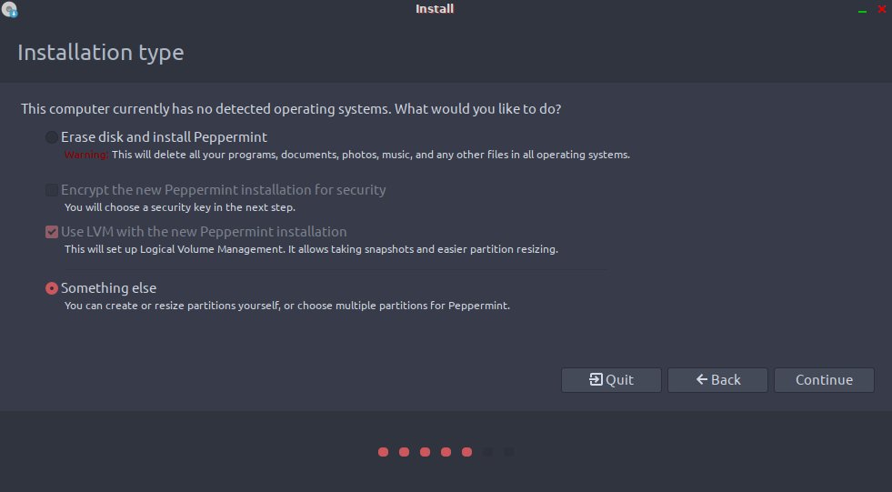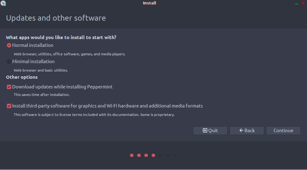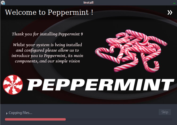 Po naštartovaní PC z bootovacieho média môžeme ihneď začať s nasadzovaním systému, prípadne si spustiť najprv live OS. Odtiaľ potom môžeme pokojne inštalovať neskôr, napr. počas pozerania filmu. Základné ovládače na prehrávanie multimédií sú už predpripravené. Inštalátor si od nás pri behu veľa informácií nevyžaduje, keďže Peppermint ponúka spočiatku len nevyhnutnú programovú výbavu. Ak by sme chceli používať aj non-free softvér, nastavíme si to práve počas tohto kroku. Celý proces je lokalizovaný do slovenčiny i češtiny. Toto nastavenie sa potom prenáša tiež do lokalizácie pre hotový systém. Peppermint používa Ubuntu installer, a podľa mňa ponúka vskutku jednoduchú inštalačnú procedúru.