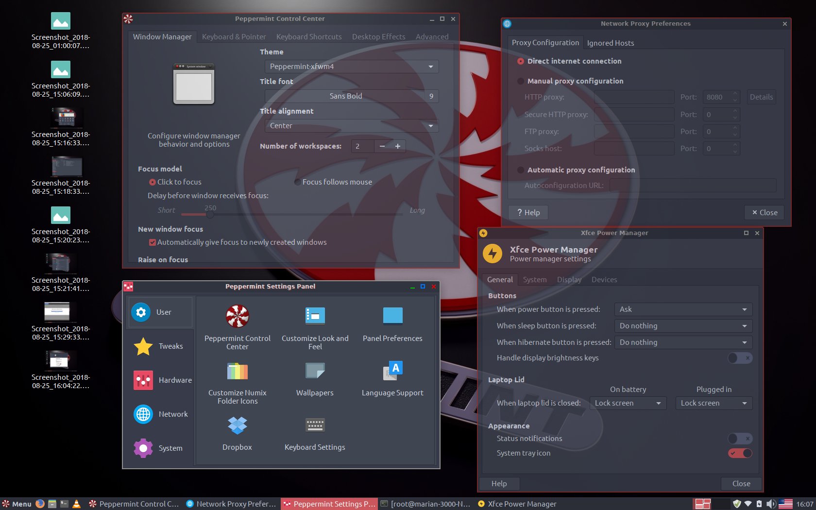 Navyše, tento linux má aj vlastné nástroje, Peppermint Control Center a Peppermint Settings panel. Boli vyvíjané tak, aby svojou filozofiou i rýchlosťou zapadli do XFCE prostredia. Z týchto programov vieme pohodlne spravovať celý systém bez nutnosti riešiť veci v konzole. Samozrejme, to sa týka len štandardných nastavení, pri ktorých sa vývojári inšpirovali u už spomínaného Bionica. Netradične musíme pochváliť tiež artwork. Z pripravených tapiet si človek naozaj nevie vybrať, navyše všetko v tejto distribúcii po grafickej stránke je také unixácke, čisté a úhľadné.